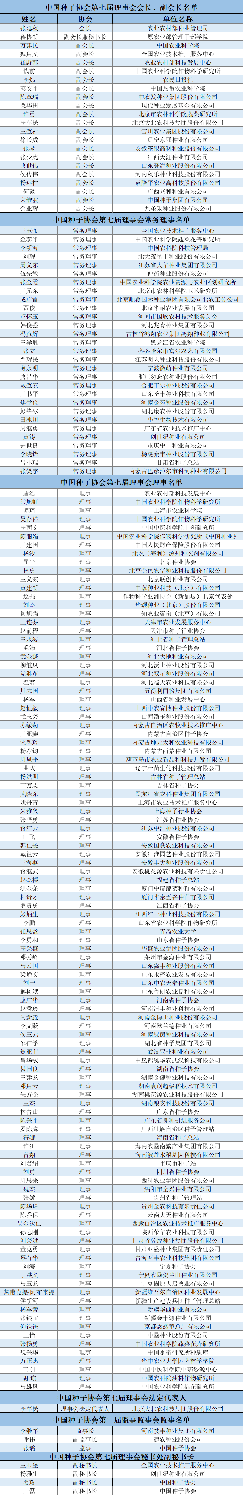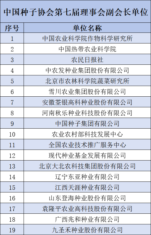 农业农村部党组成员、副部长张兴旺,中央社会工作部全国行业协会商会第十联合党委副书记、纪委书记苏凤兰,中国农业技术推广协会会长陈生斗,中国工程院院士万建民,中国科学院院士钱前,农业农村部种业管理司司长刘莉华,全国农业技术推广服务中心主任魏启文,农业农村部种植业管理司副司长李增裕,农业农村部种业管理司副司长储玉军以及中国种子协会会员代表等近400人参会,中国种子协会副会长兼秘书长蒋协新主持大会。农业农村部党组成员、副部长张兴旺出席大会并讲话。中央社会工作部全国行业协会商会第十联合党委副书记、纪委书记苏凤兰宣读了《关于中国种子协会第七届理事会负责人人选审核结果的通知》。中国农业技术推广协会会长陈生斗表示,中国种子协会第六届理事会做了大量卓有成效的工作,为我国种业持续健康发展作出了积极的贡献。在农业发展新阶段,中国农业技术推广协会愿与中国种子协会一道携手同行,精诚合作,加强科技创新,助力产业发展,大力推广农业新品种、新技术,共同为加快农业强国建设作出新的更大的贡献。会上,审议并举手表决通过了《中国种子协会第六届理事会工作报告》(审议稿)的决议(草案)、《中国种子协会第六届理事会财务报告》(审议稿)的决议(草案)、《中国种子协会第一届监事会工作报告》(审议稿)的决议(草案),审议并无记名投票表决通过了《中国种子协会章程》(修订草案)的决议(草案)和《中国种子协会会费标准和管理办法》(草案)的决议(草案)等,选举产生了中国种子协会第七届理事会理事、第二届监事会监事。会上,召开中国种子协会第七届理事会第一次会议、第二届监事会第一次会议,选举出中国种子协会第七届理事会常务理事、第七届理事会负责人和第二届监事会监事。选举张延秋同志为第七届理事会会长,蒋协新同志为副会长兼秘书长,表决同意李军民同志为理事会法定代表人,李继军同志当选中国种子协会第二届监事会监事长、谢伟同志当选第二届监事会副监事长,王玉玺、杨雅生、姜玫和王磊同志为中国种子协会秘书处副秘书长。中国种子协会第七届理事会会长张延秋表示,新一届理事会面临着实现种业振兴目标、种业企业担当创新主体、加强社会组织管理的时代要求。新的时代要求呼唤新的时代责任,新一届理事会要凝聚协会会员力量,增强协会服务功能,加强协会自身建设,牢记协会宗旨,不忘会员期待,恪尽职守,勤勉工作,努力开创协会工作新局面,为中国种业振兴贡献智慧和力量。会上,张延秋会长、万建民副会长、钱前副会长、魏启文副会长、崔野韩副会长为中国农业科学院作物科学研究所、中国热带农业科学院、农民日报社、中农发种业集团股份有限公司、北京市农林科学院蔬菜研究所、雪川农业集团股份有限公司、安徽荃银高科种业股份有限公司、河南秋乐种业科技股份有限公司、中国种子集团有限公司、农业农村部科技发展中心、全国农业技术推广服务中心、现代种业基金发展有限公司、北京大北农科技集团股份有限公司、辽宁东亚种业有限公司、江西天涯种业有限公司、山东登海种业股份有限公司、袁隆平农业高科技股份有限公司、广西兆和种业有限公司、九圣禾种业股份有限公司共计19家副会长单位颁发牌匾。大会期间,还召开了中国种子协会七届第一次常务理事会。